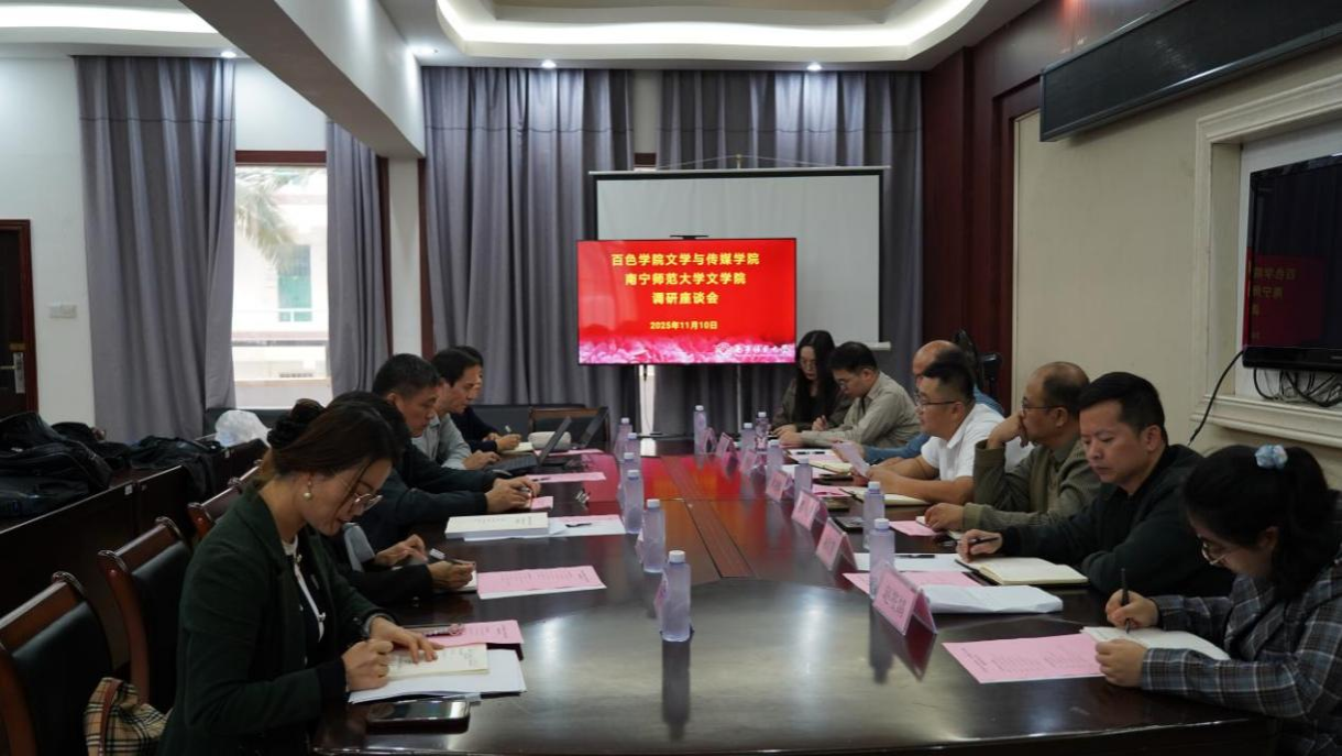 为加强区域间高校交流合作,11月10日上午,百色学院文学与传媒学院党委副书记、院长刘继辉,党委副书记滕韧,副院长李俊文等7位院领导及专业骨干教师到best365官网文学院开展交流学习。文学院党委书记石勇、副院长刘振平(主持行政工作)等人热情接待了刘继辉院长一行。