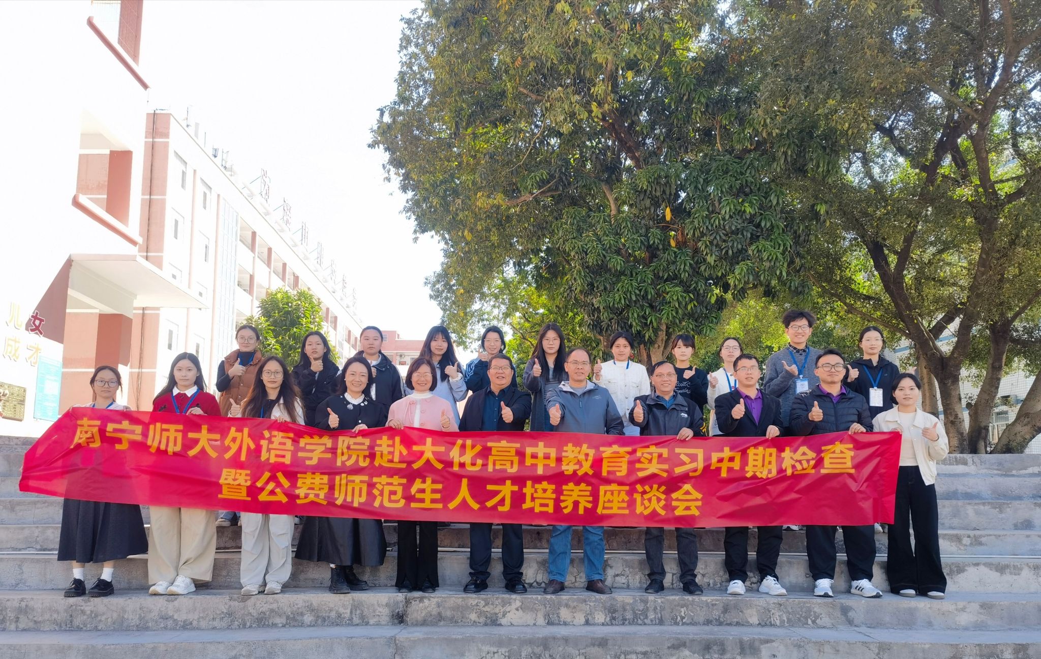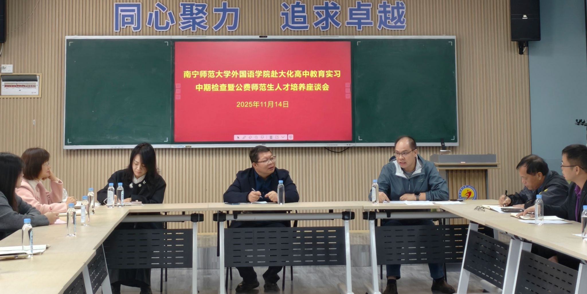 11月14日上午,外国语学院赴大化高中教育实习中期检查暨公费师范生人才培养座谈会在大化瑶族自治县高级中学3号教学楼强师工作室圆满召开。外国语学院张晓鹏副院长,教师教育教研室主任林绍丽老师,区级教师教育类课程教学团队负责人邓芳娇老师,大化瑶族自治县高级中学主管教学的黄克勋副校长,教务处韦金宏主任及实习生指导教师代表,以及外国语学院2022级英语专业公费师范实习生共同参会,会议由大化高中韦标东老师主持。