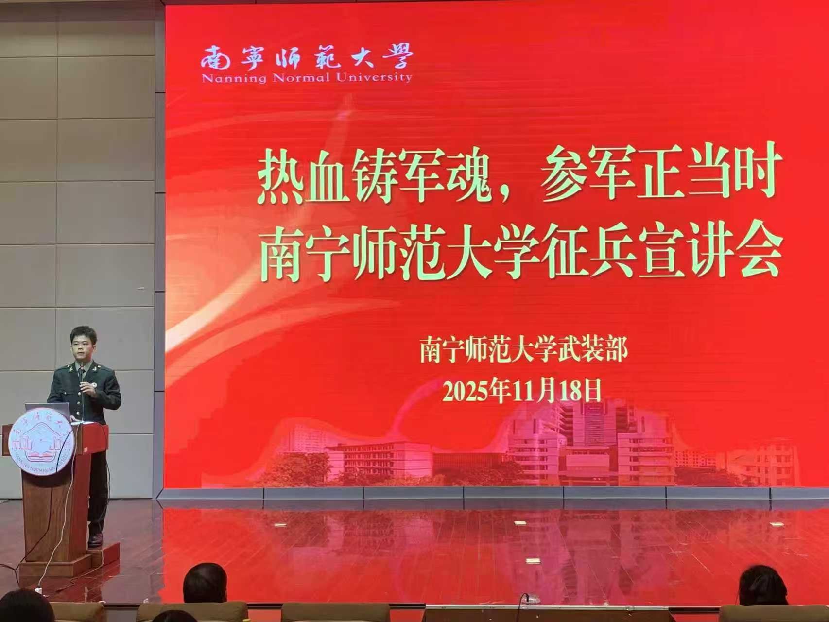 为深入贯彻新时代习近平强军思想,激发青年学子投身国防建设的使命担当,2025年11月18日,best365足球官网武装部以“热血铸军魂,报国正当时”为主题,在武鸣、五合两校区分别举行征兵宣讲会。此次活动旨在引导广大学子将个人理想融入强国强军伟业,现场气氛庄重热烈,充分展现了新时代青年胸怀家国、勇于担当的精神风貌。