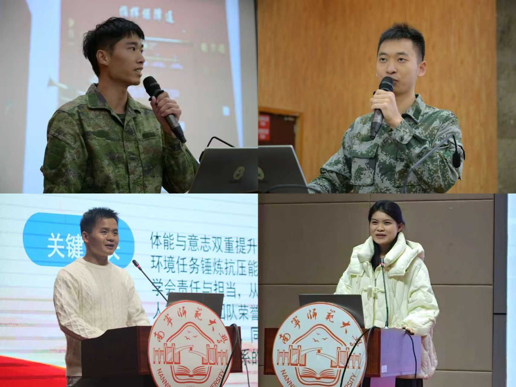 经验分享环节,化学与材料学院黄梓礼、物理与电子学院陈淘、马克思主义学院钟宗川、雷海琪四位优秀退役复学大学生,深情讲述了他们从校园到军营的成长历程。他们用真挚的语言分享了在部队这个大熔炉中淬炼成钢的感人故事,展现了军旅生涯对个人意志品质、能力素质的全面提升,以实际行动诠释了“青春因磨砺而出彩,人生因奋斗而升华”的深刻内涵。