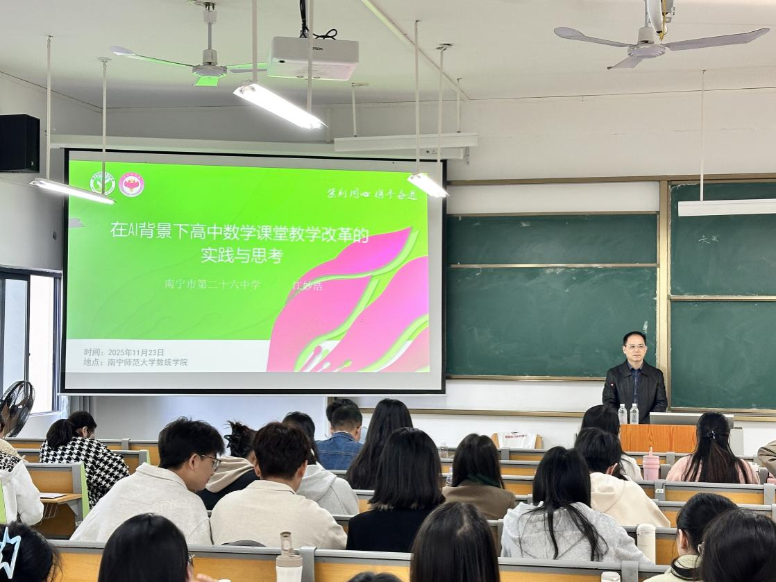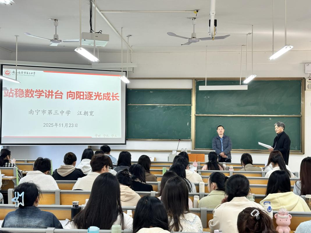 同时,来自南宁三中、十四中、二十六中、三十三中、天桃实验学校的五位校外硕导,为研究生作了精彩的报告,内容涉及中学教学改革、践行教育家精神、拔尖人才培养等,为学生提供了数学教学改革研究的方法,点亮了研究生的“数学眼光”。