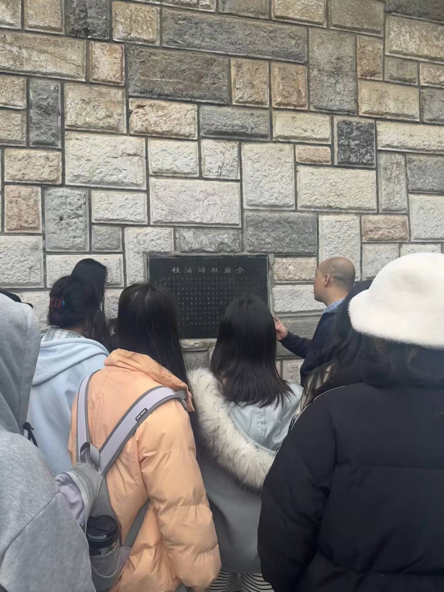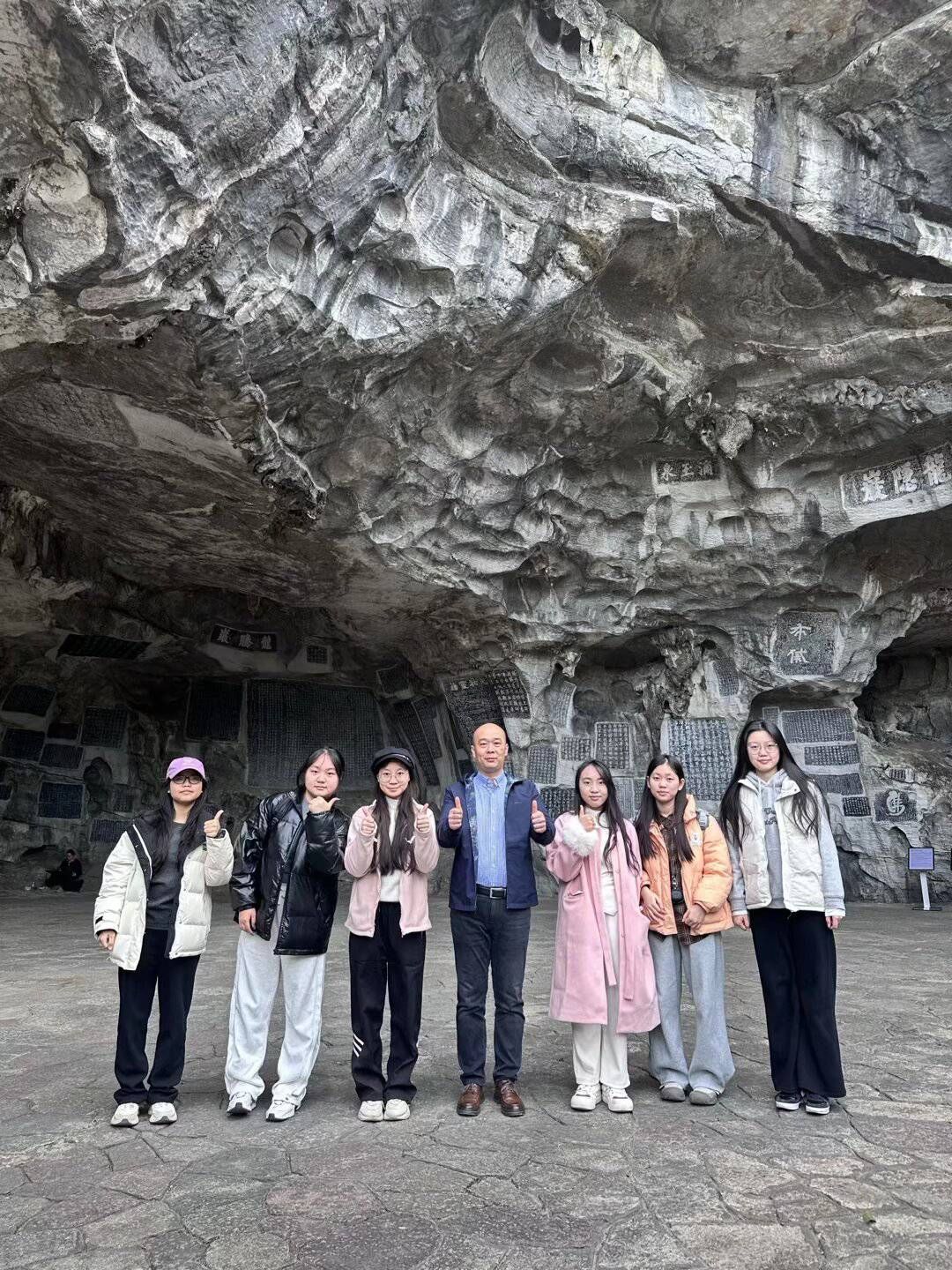 在班主任刘儒老师的带领下,同学们参观了桂海碑林多个展馆及龙隐岩石刻遗址。刘老师结合碑文实物,为同学们系统讲解其历史背景与文化内涵。同学们认真聆听、积极思考,在真实的文化场景中加深对文学与历史交融的理解。