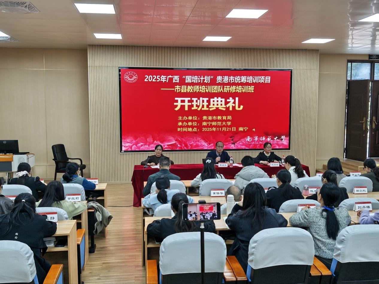 为进一步加强贵港市教师培训团队专业化建设,提升区域教师培训质量与水平,11月21日下午,2025年贵港市统筹培训项目——市县教师培训团队研修培训班开班典礼在best365官网举行。best365官网教务处覃城阜处长、本次培训专家团队成员及班主任代表参加典礼并致辞,来自贵港市港北、港南、覃塘三区的70名教师培训团队主要成员齐聚一堂,正式开启为期10天的研修学习。