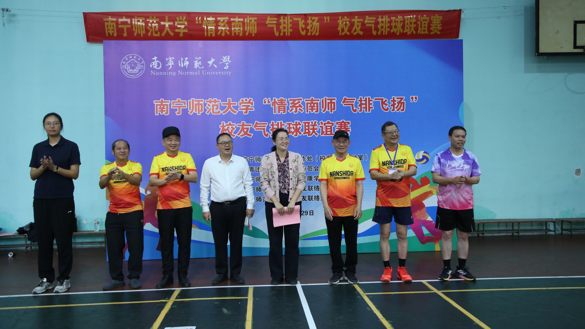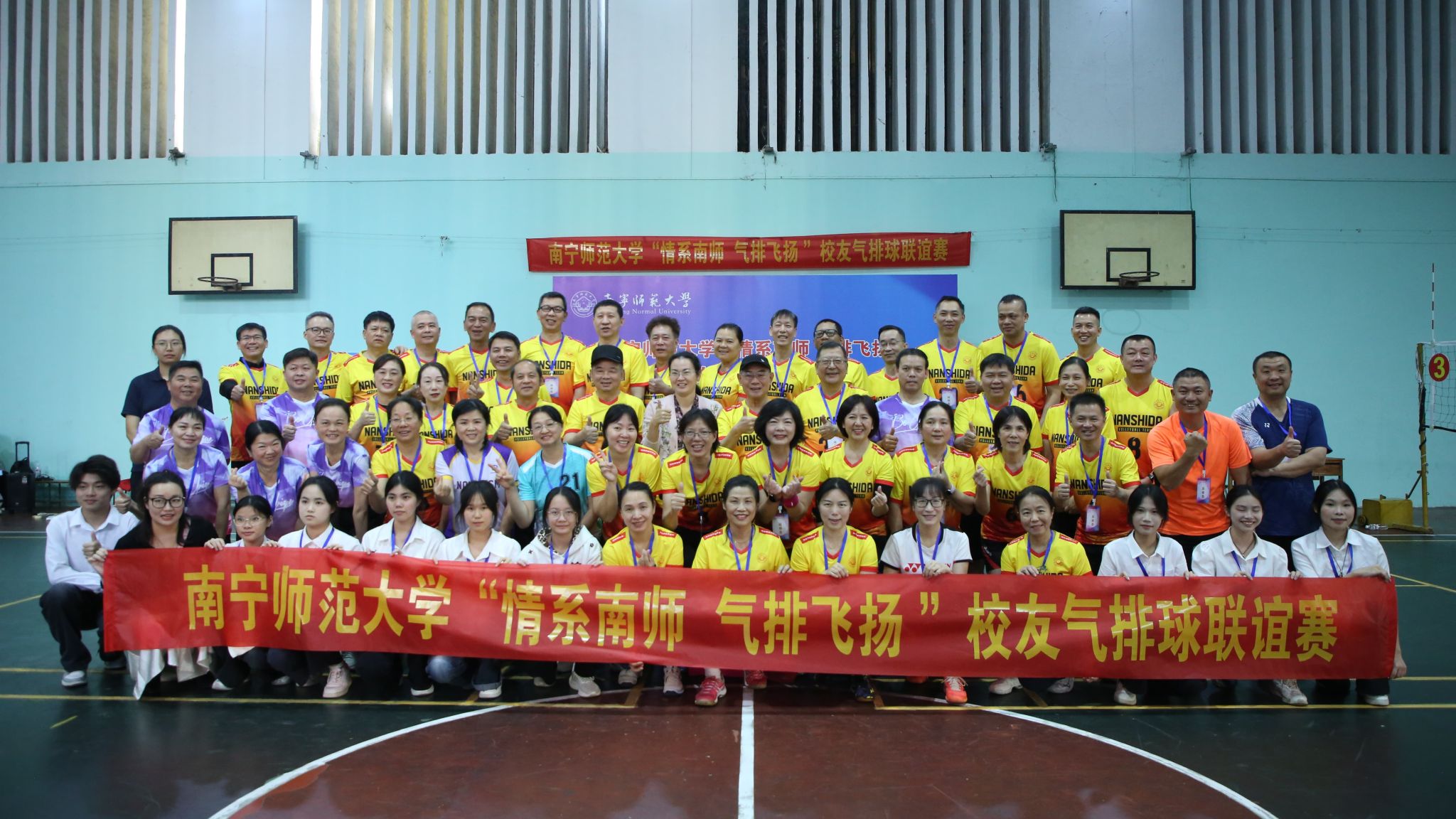 为进一步加强校友与母校的情感联结,搭建交流互动平台,营造和谐校园氛围,11月29日,由国内合作处(校友工作办公室)、校团委和体育与健康学院联合主办,南宁、崇左校友联络处承办的best365足球官网“情系南师、气排飞扬”校友气排球联谊赛在明秀校区体育馆进行。本次比赛共有校友及教职工组成的9支队伍、53名选手参赛。