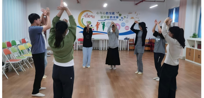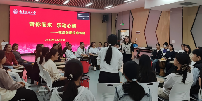 本次活动,特邀来自南宁市第五人民医院陈法群医生和广西社会福利医院梁頔医生提供专业支持。活动中,舞动疗愈专场由陈法群医生带领,通过“镜像练习”“团体动作共创”等专业环节,引导参与学生在身体表达中打破拘谨、疏通情绪,在安全包容的团体氛围里实现从个体表达到集体联结的积极转变。鼓圈疗愈专场则由梁頔医生带领,参与者围绕乐器即兴合奏,在带领者肢体动作、手势与节奏的引导下,击打或摇晃手中的乐器,在一阵阵的击打声种释放压力,收获平静与愉悦。两类活动虽形式各异,却共同为学生提供了情绪释放与内在探索的专业空间,活动后学生们普遍反馈“放松、开心、有归属感”,展现了艺术形式对心理调适的独特作用。