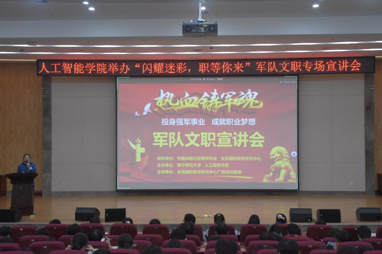 为深入了解军队文职政策,精准对接优质岗位,助力学生拓宽就业渠道,11月4日,人工智能学院在图书馆报告厅成功举办“闪耀迷彩,职等你来”军队文职专场宣讲会。学院邀请广西汇佰强教育投资有限公司(校友企业)教培部总监李忠,作题为“投身强军事业,成就职业梦想”的主题分享,广西汇佰强教育投资有限公司总经理姜川、校企合作部总监韦伟荣、学院辅导员林雪以及270余名学生参加宣讲会。