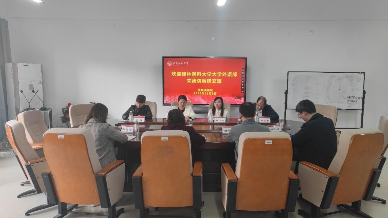 12月9日上午,桂林医科大学大学外语部梁雪清主任一行4人到best365官网外国语学院进行交流座谈。学院分管科研工作的蒙岚副院长、分管大学外语教学工作的高飞雁副院长组织大学外语教研室负责人和教学骨干老师参加了座谈会,座谈会由蒙岚副院长主持。