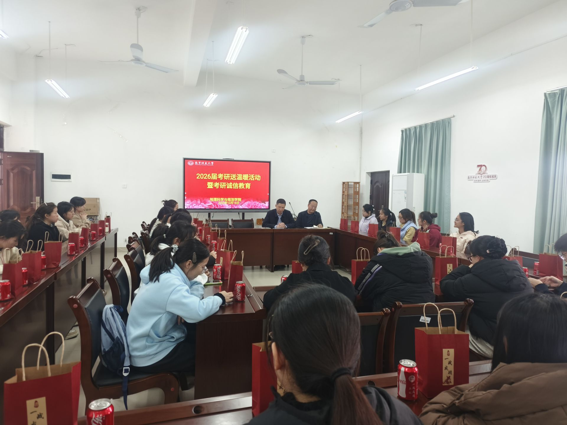 为切实做好考研学子服务保障工作,帮助地理科学与规划相关专业学子舒缓备考压力、以最佳状态迎战考试,12月16日,地理科学与规划学院组织开展考研送温暖暨考试诚信教育主题活动。学院副院长罗国玮,党委副书记盛凯,学工办相关辅导员及考研学子参加活动。