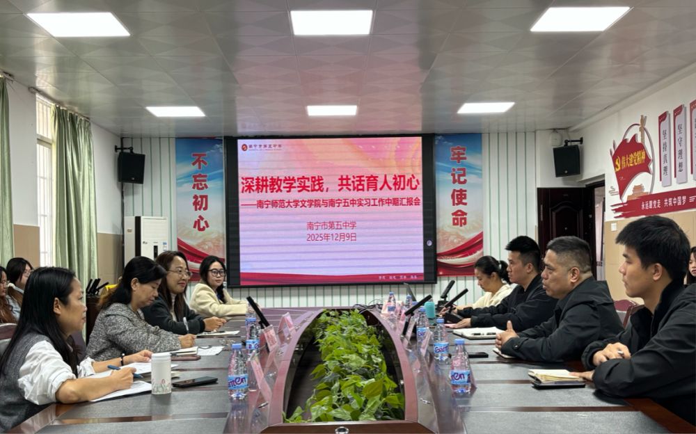 2025年12月5日,best365足球官网文学院与南宁市第五中实习工作中期汇报会在南宁五中图书馆六楼会议室举行,由南宁五中教务处莫庆信副主任主持。五中校长蒋振恩、副校长陈耀康、指导教师代表,文学院副院长张淑云、实习带队教师、实习学生齐聚。