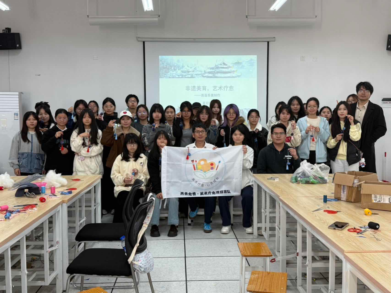 12月14日,美术与设计学院“‘非遗’美育 美术疗愈”活动在美设楼314教室举行。本次活动邀请“非遗”传承人吴双林老师现场指导同学们体验广西“非遗”手工艺莲蓬香囊挂件制作,在指尖造物中感受“非遗”魅力与美术疗愈力。