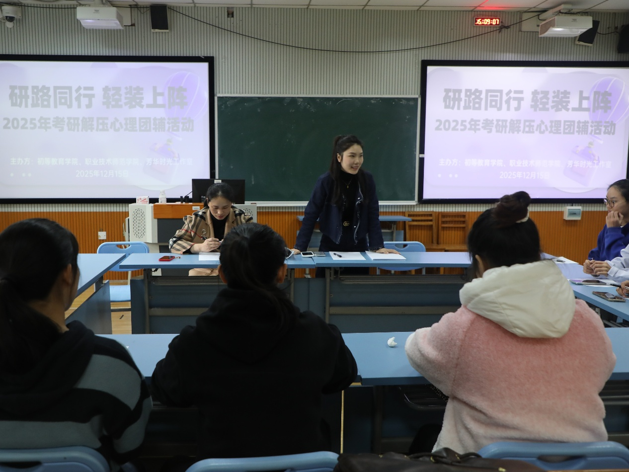 为助力大二、大三备考学子明确方向、减轻迷茫感,同时为大四冲刺考生缓解压力、调整状态,12月15日下午,初等教育学院与职业技术师范学院在明秀校区文星楼302教室,联合举办考研解压心理团辅活动。本次活动主要面向初等教育学院与职业技术师范学院大二、大三有意向考研的学生,以及正处于备考冲刺阶段的大四考研学生。