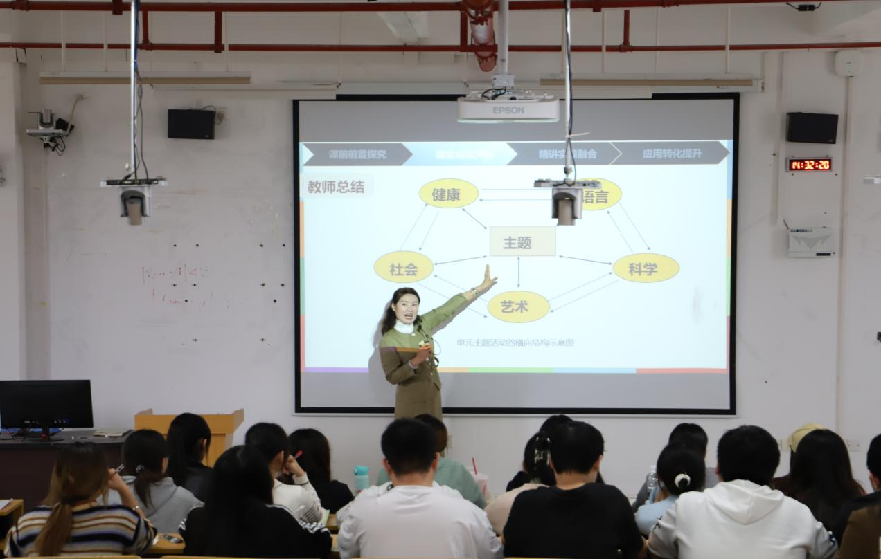 本次公开课由学前教育系的刘青青老师主讲单元主题活动的设计与实施。刘老师围绕“什么是单元主题活动”“单元主题活动的特点”以及“如何设计主题网络图”三大核心内容展开授课与学生互动,以生动形象、通俗易懂的方式进行讲解各个知识点。