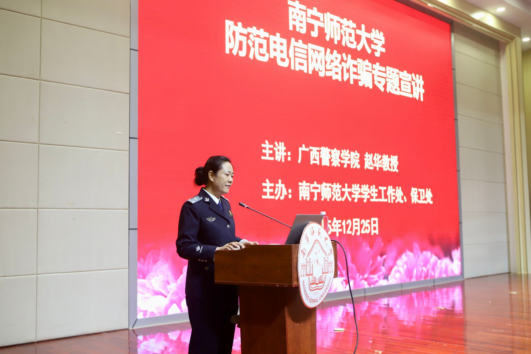 12月25日,自治区教育厅反诈专家宣讲团赵华教授到best365官网五合校区文理综合楼114报告厅顺利开展了反诈防骗主题宣讲活动。best365官网党委学生工作部副部长邓运明、有关学院辅导员与保卫处负责同志全程参与,现场共有约300名学生参加。