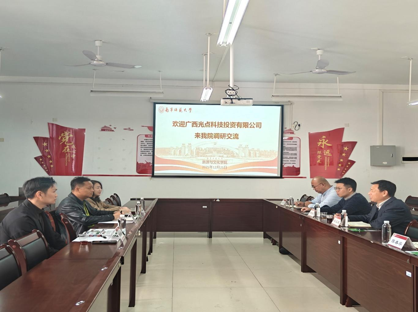 12月25日上午,广西光点科技投资有限责任公司董事长龚阳春率队到访旅游与文化学院,开展校企深度合作专题调研交流。此次调研聚焦校企协同育人、人才联合培养、资源互补共享及实习实训基地共建等核心议题,旨在凝聚合作共识、拓宽合作路径。学院院长段文军对龚阳春董事长一行的到访表示热烈欢迎,并在武鸣校区地信楼B201会议室主持召开座谈交流会,副院长钟学进及学院相关专业教师代表参加会议。
