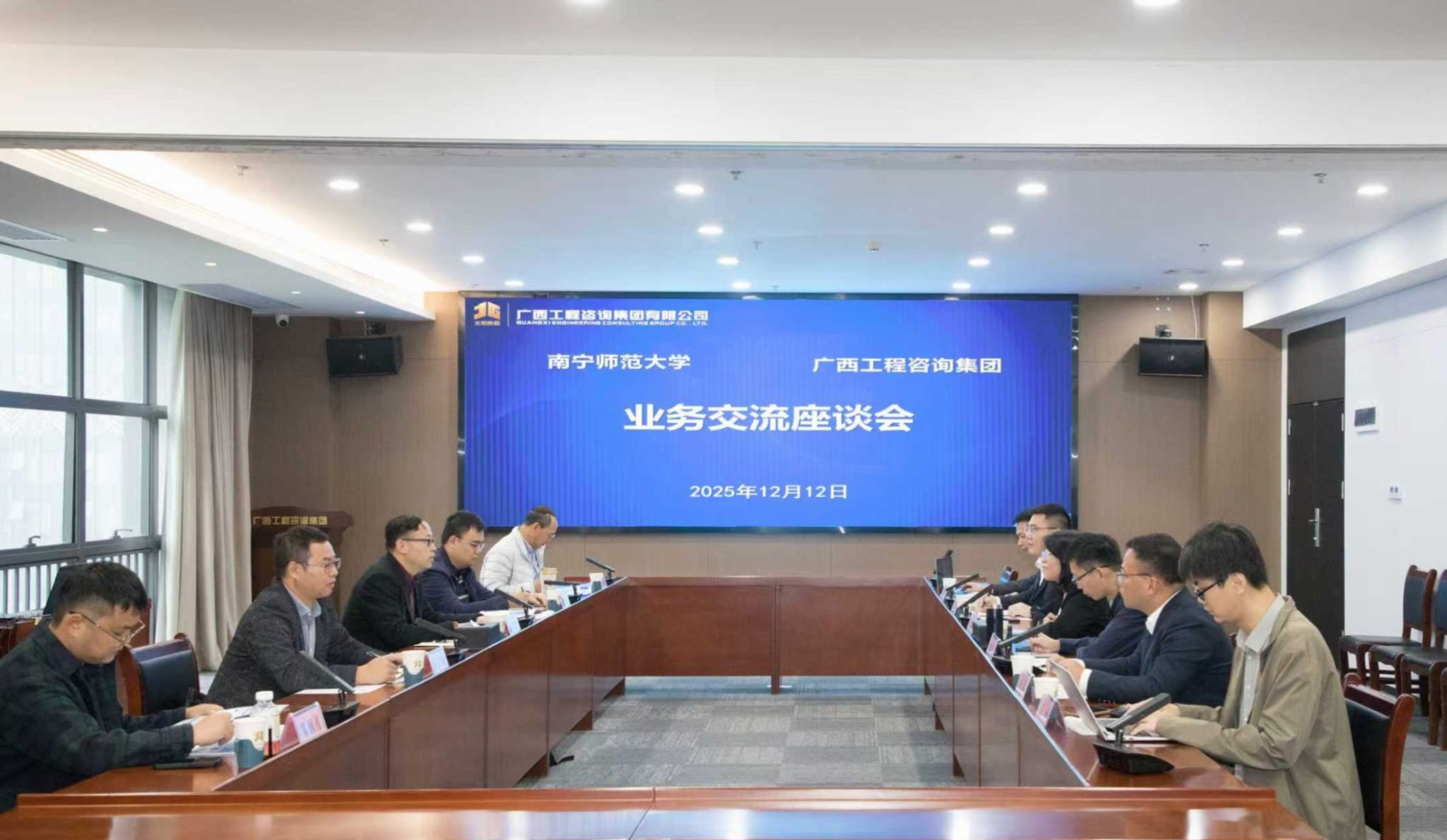 2025年12月12日上午,地理科学与规划学院赵银军副院长带队赴广西工程咨询集团(广西能源大厦D座10楼1021会议室)开展业务交流座谈会。