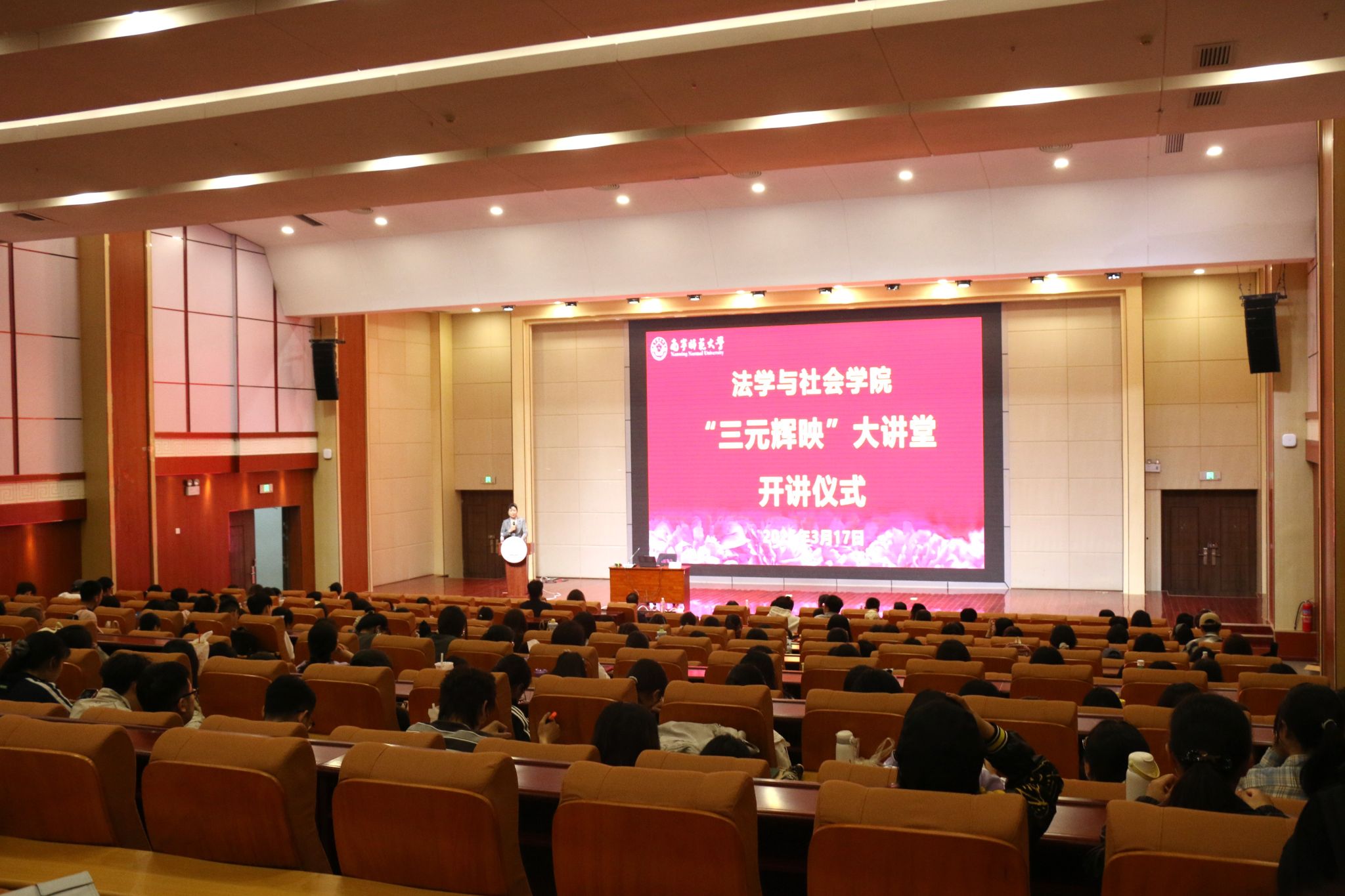 为营造浓厚学术氛围,3月17日晚,法学与社会学院以马年新春开新局、启新程的奋进姿态,在五合校区文楼114报告厅隆重举行“三元辉映”大讲堂开讲仪式暨首场报告会。学院党委书记许建、副院长吴少进(主持行政工作)和党委副书记张建梅,教师代表、研究生代表和本科生代表近200人参加了本次活动。