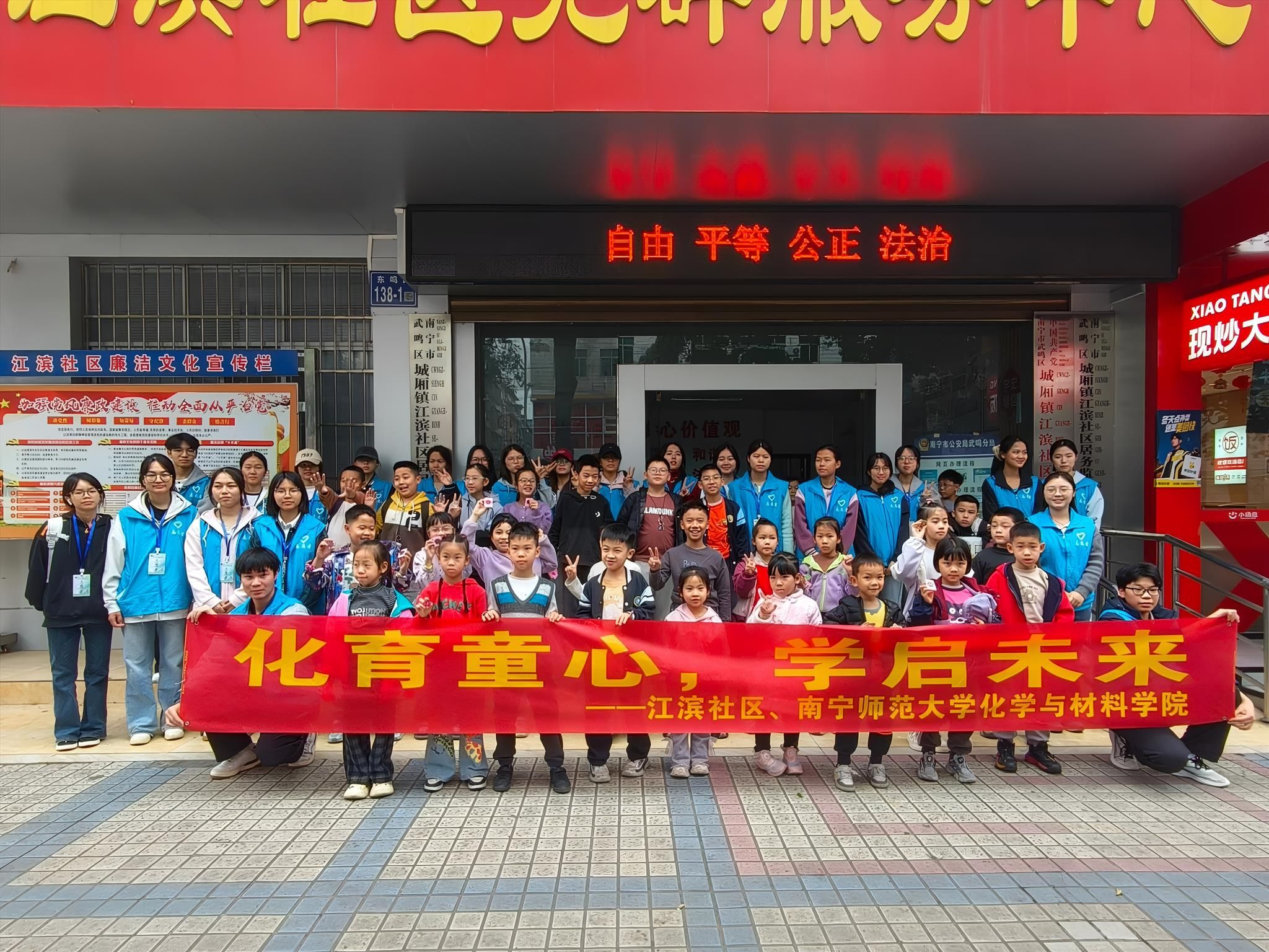 为激发社区孩子们探索化学世界的好奇心,助力化材学院学子将专业知识融入趣味科普教学,化学与材料学院联合南宁市武鸣区城厢镇江滨社区,于3月22日成功开展“化育童心,学启未来”趣味化学课堂活动,为社区儿童开启一场生动有趣的科学启蒙之旅。