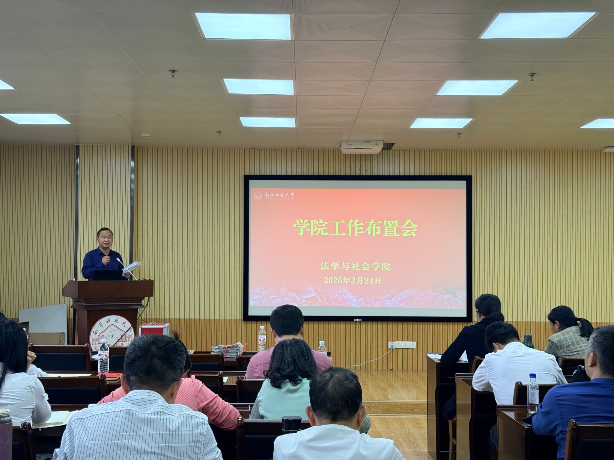为全面总结年度工作成效,压实新学期工作责任,凝聚全院教职工奋进力量,3月24日下午,法学与社会学院在五合校区理综720会议室召开2026年春季学期第二次全体教职工大会。会议由学院党委书记许建主持,学院领导班子成员、全体任课教师及行政教辅人员参会。