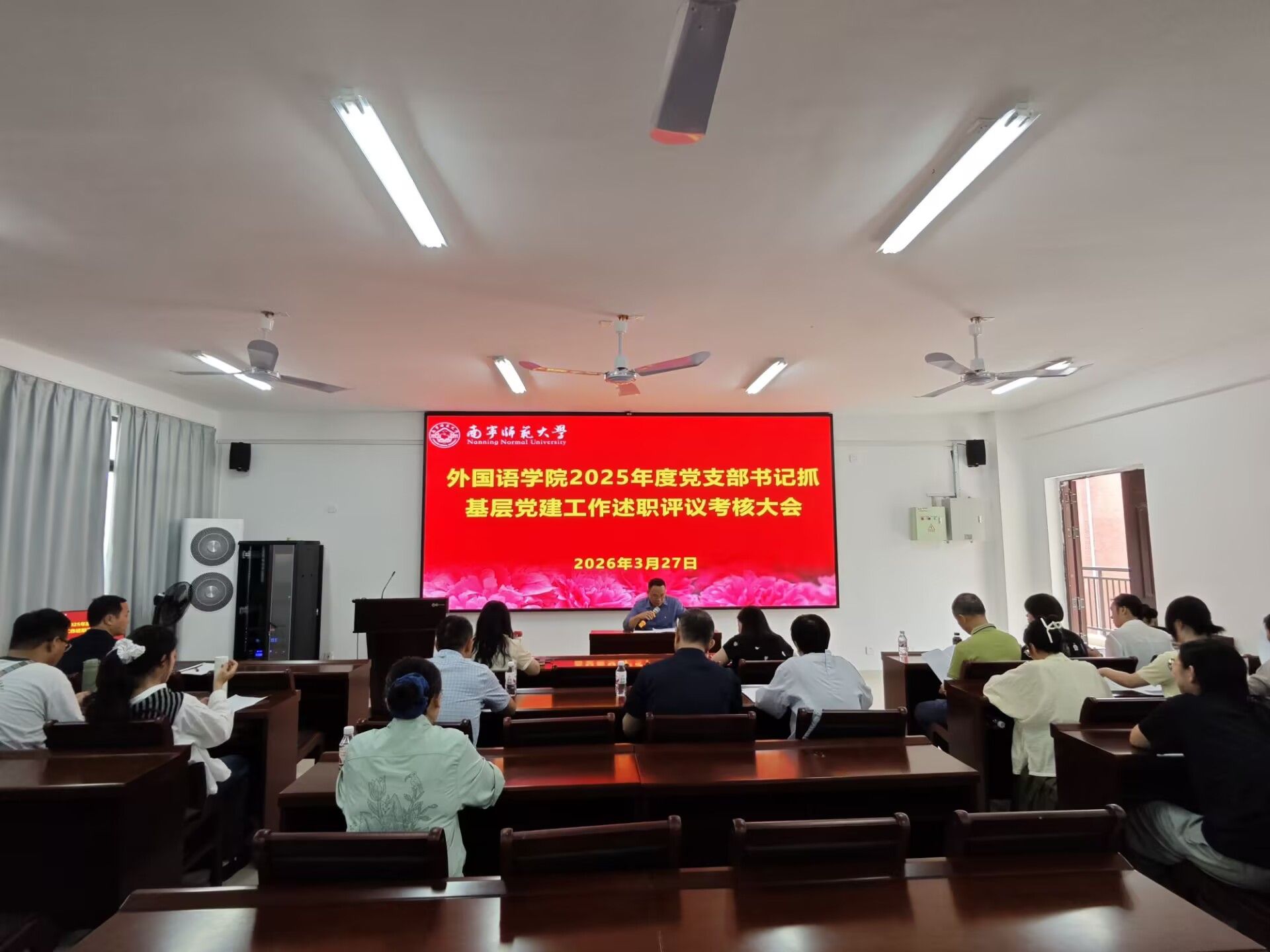 3月27日下午,外国语学院在武鸣校区实验教学楼B515教室召开2025年度党支部书记抓基层党建工作述职评议会。会议由学院党委书记苏华主持,学院党委委员、学院纪委委员、各党支部书记参加会议。