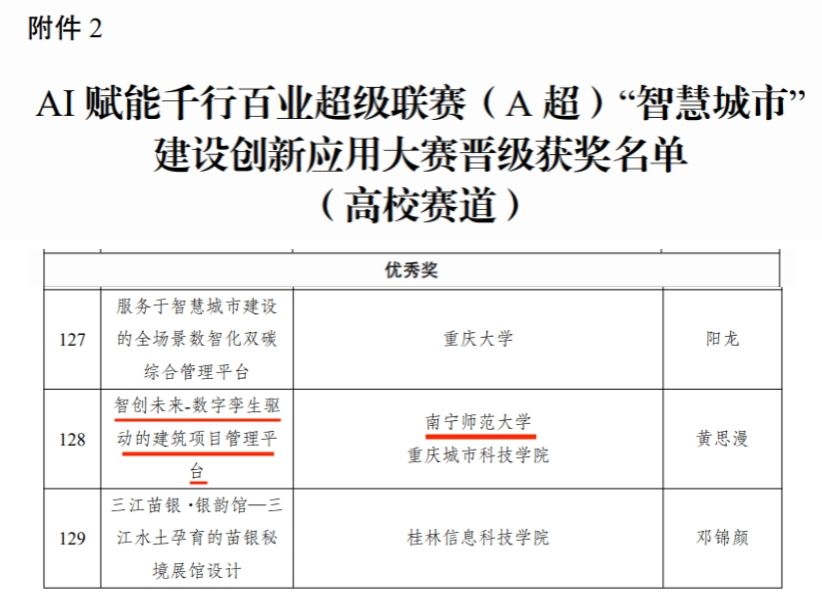 3月29日,由best365官网自然资源与测绘学院牵头,联合重庆城市科技学院,在王永卿老师、王妙灵老师、凌恺老师的悉心指导下,黄思漫等七名同学组成的队伍表现出色,凭借《智创未来-数字孪生驱动的建筑项目管理平台》项目,在AI赋能千行百业超级联赛(A超)“智慧城市”建设创新应用大赛(高校赛道)中荣获优秀奖。