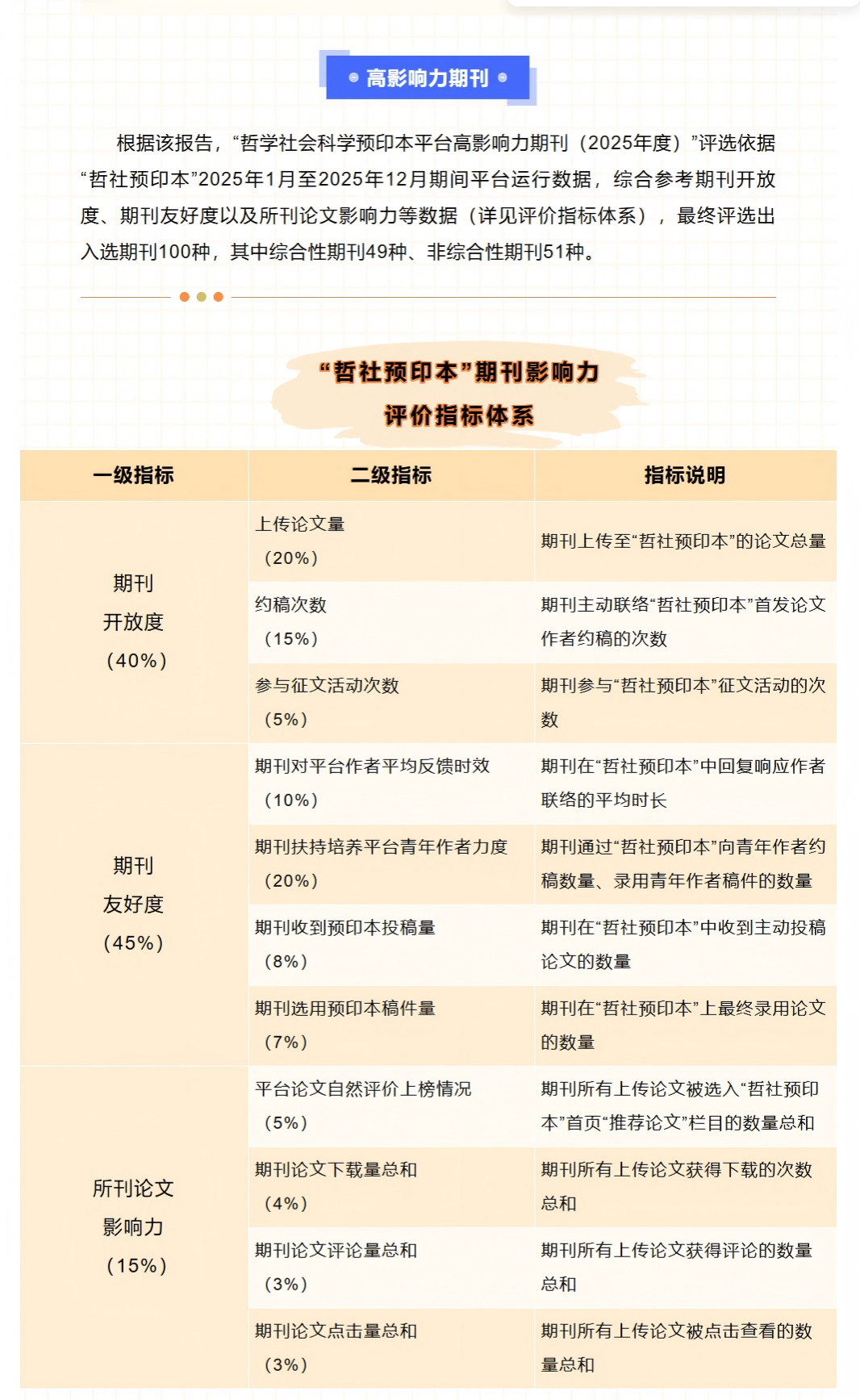 哲学社会科学预印本平台自2024年4月25日正式上线以来,获得了学界的广泛关注。截至目前,注册作者5万多人,发布论文7万多篇,签约的合作期刊达800余家,已成为国内最活跃的预印本平台。开展预印本成果评价,对建构中国自主的知识体系、推动“原创导向”的学术评价体系改革具有重要意义。为此,中国人民大学书报资料中心、中国哲学社会科学自主知识体系数字创新平台(学术世界)积极探索,推出“哲学社会科学预印本平台高影响力论文、期刊评价研究报告”。根据该报告,“哲学社会科学预印本平台高影响力期刊(2025年度)”评选依据“哲社预印本”2025年1月至2025年12月期间平台运行数据,综合参考期刊开放度、期刊友好度以及所刊论文影响力等数据,最终评选出入选期刊100种,其中综合性期刊49种、非综合性期刊51种。