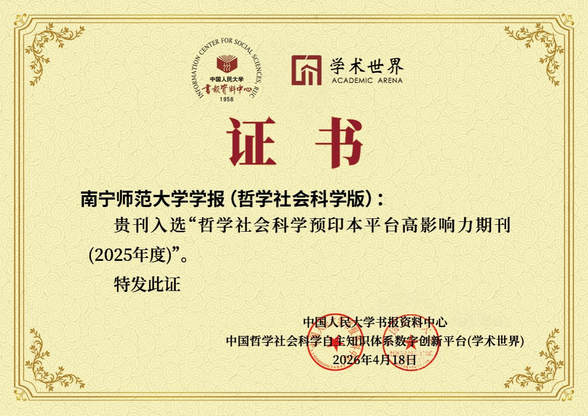 4月18日,在中国人民大学举行的“2026年中国人民大学复印报刊资料转载指数发布暨‘人工智能+哲学社会科学研究’论坛”上,中国人民大学书报资料中心、中国哲学社会科学自主知识体系数字创新平台(学术世界)发布了《哲学社会科学预印本平台高影响力论文、期刊评价研究报告(2025年度)》。《best365足球官网学报(哲学社会科学版)》入选,本年度区内仅有两种学术期刊入选。