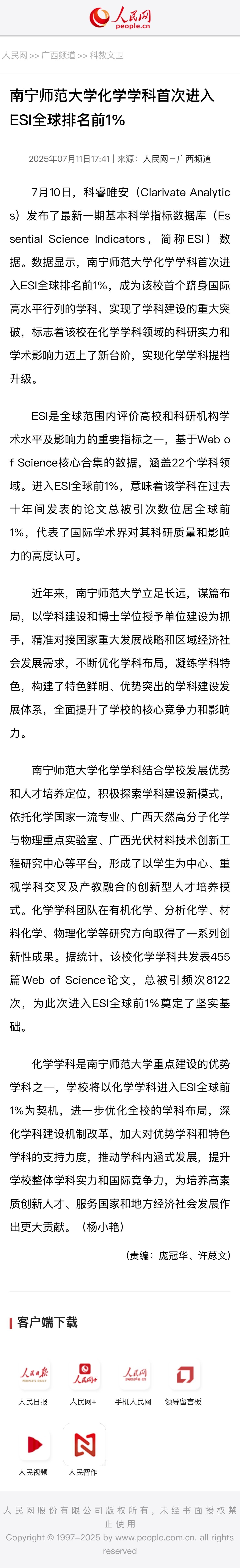 【人民网】best365足球官网化学学科首次进入ESI全球排名前1%