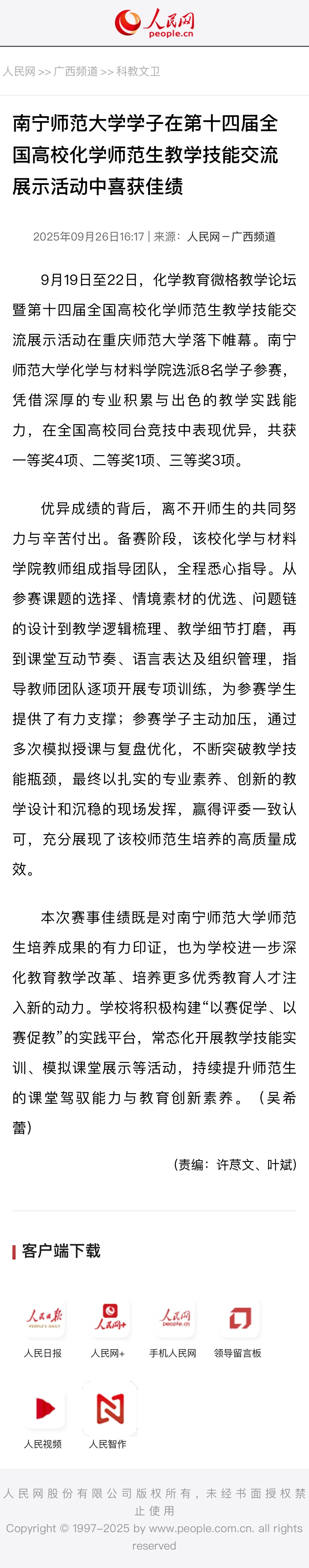 【人民网】best365足球官网学子在第十四届全国高校化学师范生教学技能交流展示活动中喜获佳绩