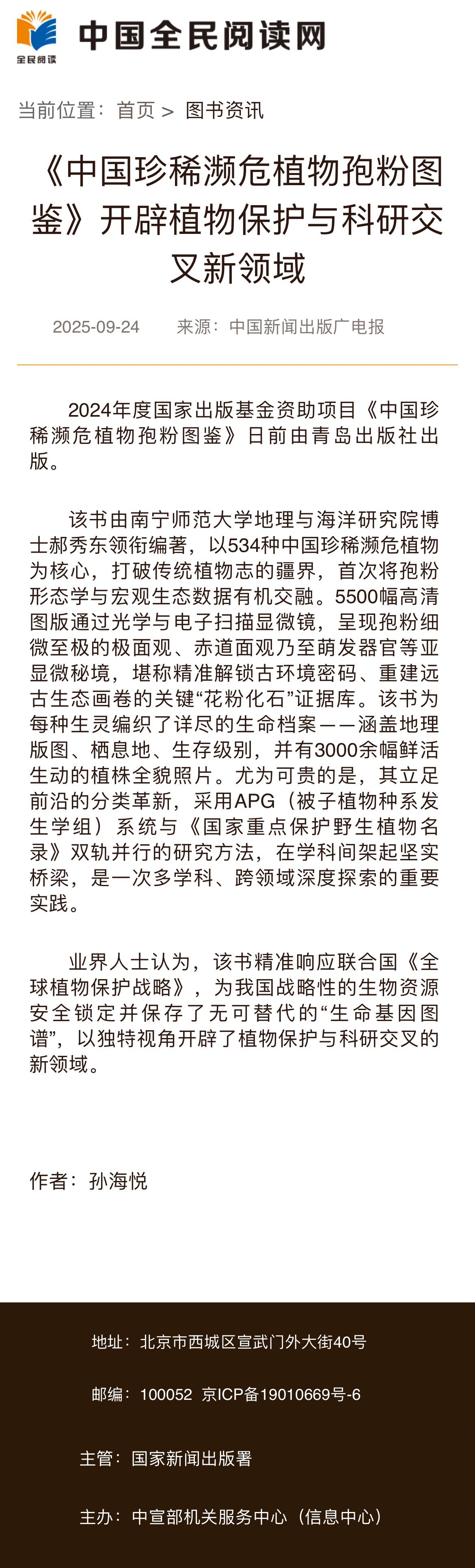 【中国全民阅读网】《中国珍稀濒危植物孢粉图鉴》开辟植物保护与科研交叉新领域