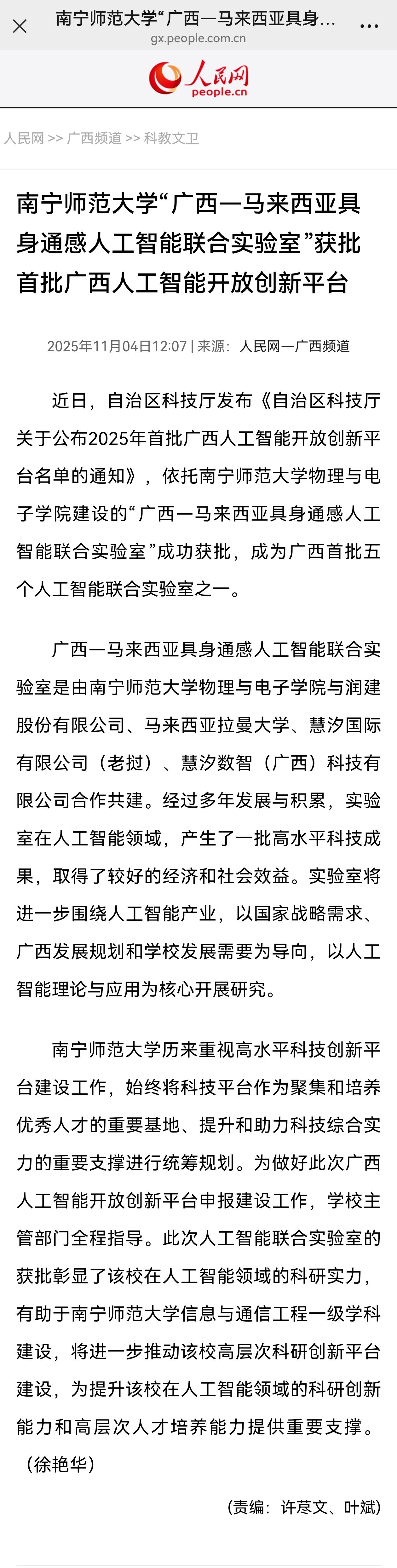 【人民网-广西频道】best365足球官网“广西—马来西亚具身通感人工智能联合实验室”获批首批广西人工智能开放创新平台