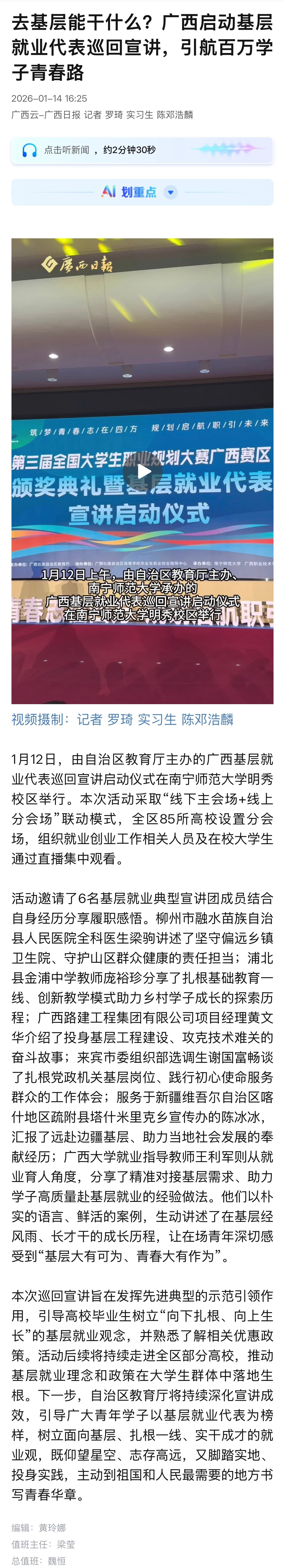 【广西云】去基层能干什么?广西启动基层就业代表巡回宣讲,引航百万学子青春路
