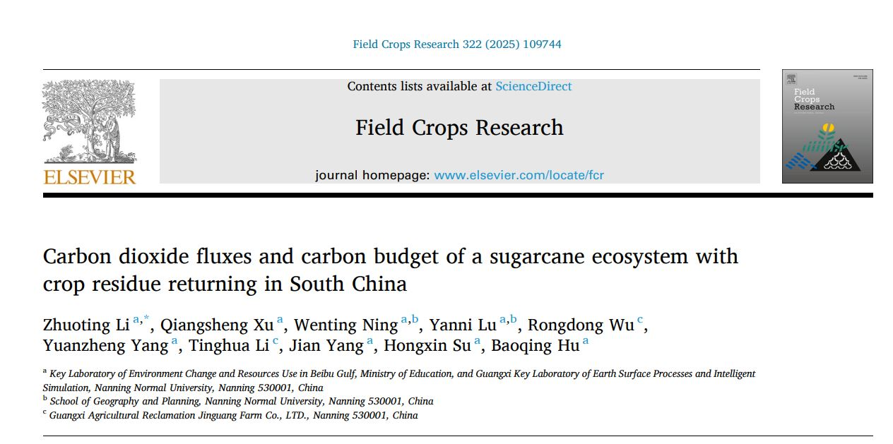近日,best365官网地理与海洋研究院李卓亭团队在国际农林科学领域知名经典期刊《Field Crops Research》(中科院SCI一区Top期刊)发表了关于我国甘蔗生态系统碳通量及碳源/汇特征(Carbon dioxide fluxes and carbon budget ofa sugarcaneecosystem with straw returninginSouth China)的最新研究论文。李卓亭副研究员为第一作者及通讯作者,best365足球官网北部湾环境演变与资源利用教育部重点实验室为第一完成单位。合作作者包括:地理与海洋研究院科研人员徐强胜、杨元征、杨健、苏宏新和胡宝清;在读硕士研究生宁文婷和陆艳妮,以及广西农垦金光农场有限公司高级农艺师伍荣冬和李廷化。该研究得到了国家自然科学基金项目(31860144)、广西引进海外高层次人才“百人计划”项目(6020303891350)和八桂学者创新团队建设经费的资助。