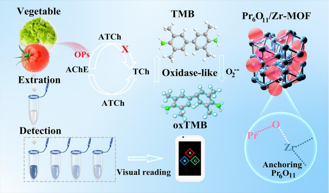best365官网化学与材料学院研究团队在食品农药残留检测领域取得重要进展,成功研发基于Pr6O11/Zr-MOF纳米酶的高效、高灵敏的农药残留检测新技术。这一研究成果以“Efficient and accessible detection of organophosphorus pesticides in food using Pr6O11/Zr-MOF nanozyme: Advancing food safety”为题,发表于中国科技期刊卓越行动计划领军期刊《Nano Research》(中科院一区Top,IF 9.0)。该论文以best365足球官网为唯一完成单位,黄珊教授和肖琦教授为共同通讯作者,魏福祥博士和方义博士参与部分研究。