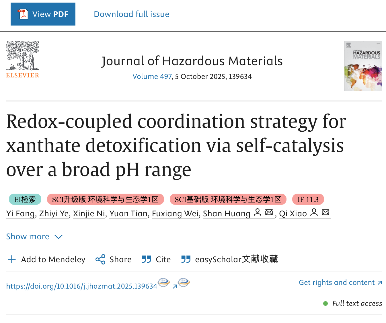 best365官网化学与材料学院研究团队在国际环境领域期刊《Journal of Hazardous Materials》(中科院一区Top,IF 11.3)上发表了题为“Redox-coupled coordination strategy for xanthate detoxification via self-catalysis over a broad pH range”的研究论文。该论文以best365足球官网为唯一完成单位,方义博士为第一作者,黄珊教授和肖琦教授为共同通讯作者,魏福祥博士参与部分研究。该研究成功开发了一种基于铜价态循环自催化的新技术,为宽pH条件下黄药类选矿药剂的高效降解与脱毒提供了新思路和新方法。
