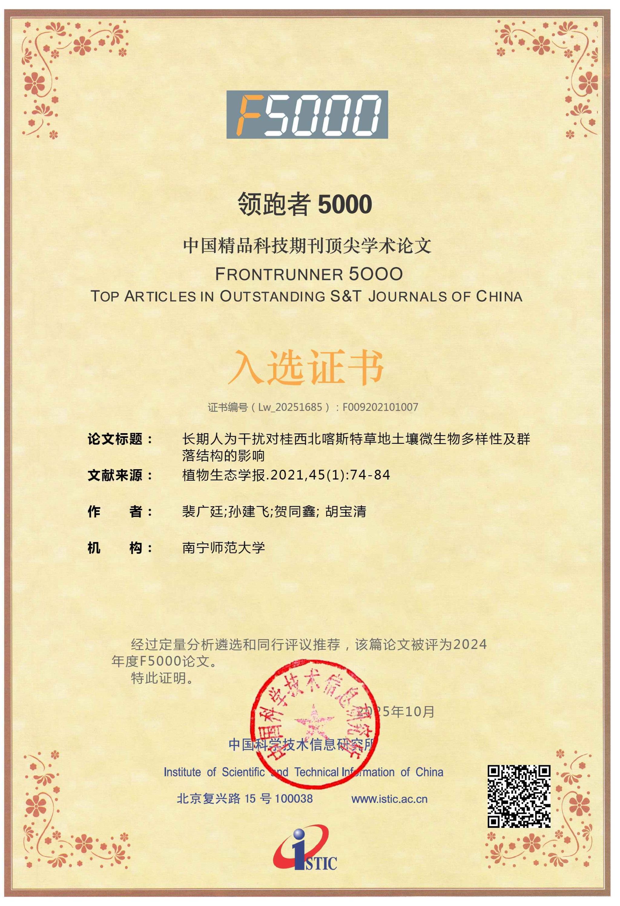 近日,国家科学技术部中国科学技术信息研究所正式发布2024年度“领跑者5000——中国精品科技期刊顶尖学术论文”(F5000)入选名单。best365官网地理与海洋研究院土壤生态过程与石漠化修复团队于2021年发表在《植物生态学报》的论文《长期人为干扰对桂西北喀斯特草地土壤微生物多样性及群落结构的影响》成功入选。该论文同时荣获《植物生态学报》2024年度“优秀论文”,并入选学术精要“高PCSI指数、高被引、高下载”论文榜单,充分彰显了其学术影响力和持续关注度。