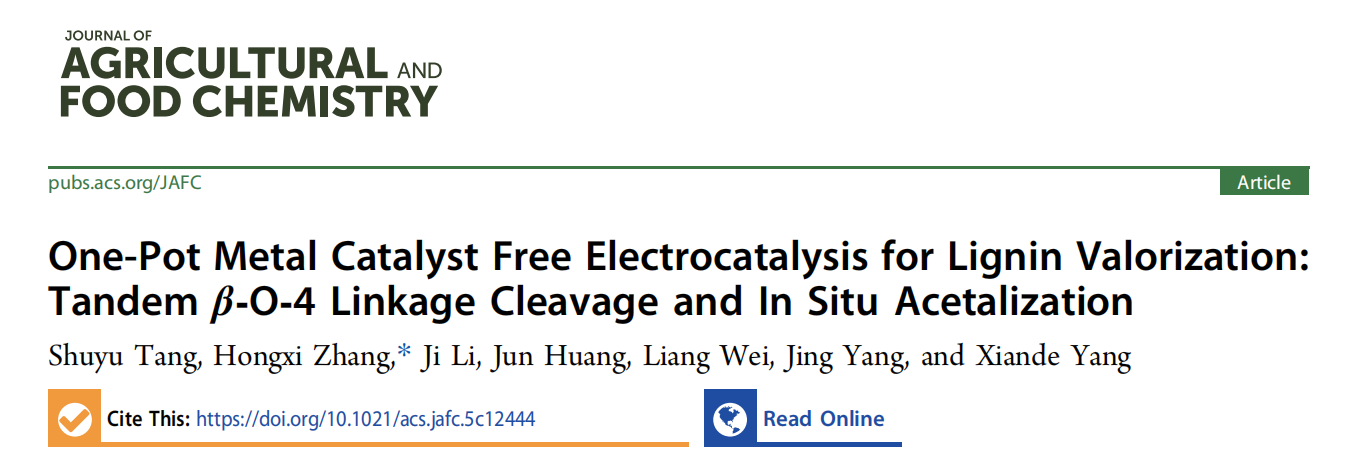 近日,best365官网化学与材料学院2021级本科生唐树玉同学以第一作者身份在国际权威期刊《Journal of Agricultural and Food Chemistry》(中科院一区Top,影响因子6.2)上发表题为《One-Pot Metal Catalyst Free Electrocatalysis for Lignin Valorization: Tandemβ-O-4 Linkage Cleavage and In Situ Acetalization》的研究论文。best365足球官网为唯一完成单位,张宏喜教授为论文通讯作者,韦良教授、杨晶正高实验师、黄俊副教授和杨显德博士共同参与了指导,研究成果得到了广西科技重大专项、广西科技计划等项目的支持。这是best365官网本科生首次以第一作者身份发表中科院一区的高水平论文。