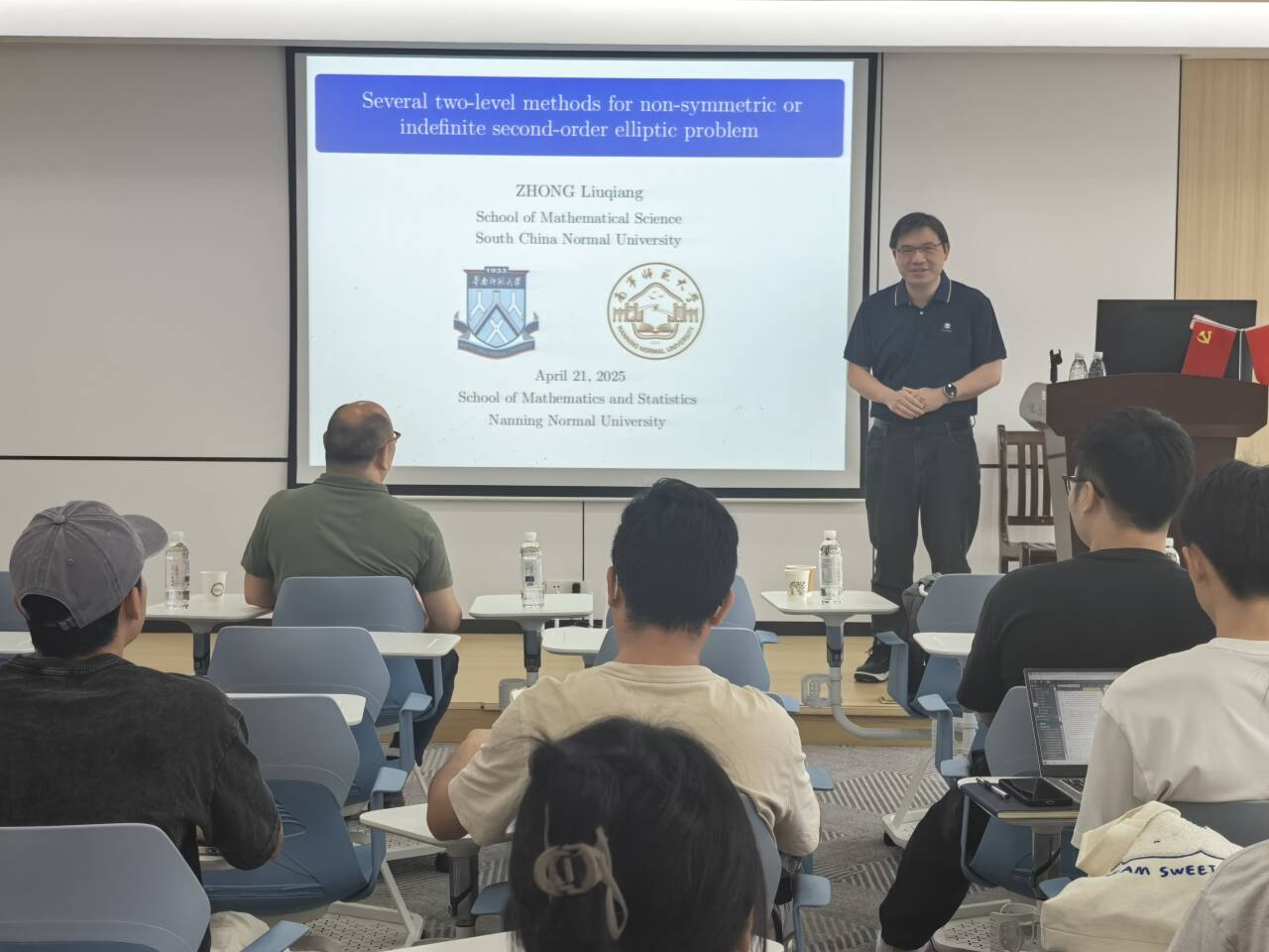 4月21日,应广西应用数学中心(best365足球官网)的邀请,华南师范大学钟柳强教授为中心骨干成员以及硕士研究生做了题目为“Several two-level methods for non-symmetric or indefinite second-order elliptic problem”的学术报告,报告由中心主任黄在堂主持。