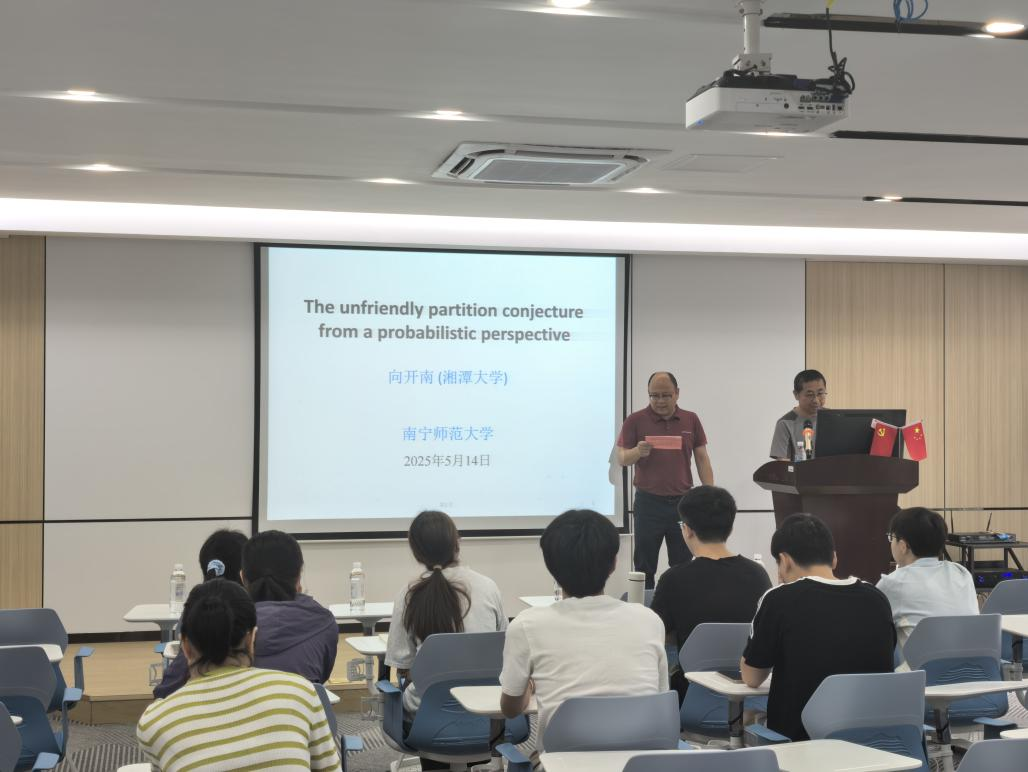 5月14日,应广西应用数学中心(best365足球官网)的邀请,湘潭大学向开南教授为数学与统计学院师生作了题为“概率论视角下的不友好剖分猜想”的学术报告。报告会由中心主任黄在堂教授主持。