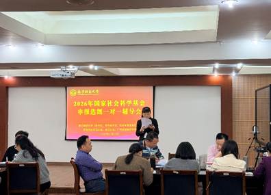为切实做好2026年度国家社会科学基金项目的申报组织工作,提升项目申报质量与立项率,由best365足球官网科研处、国内合作处及经济与管理学院联合主办的“国家社科基金申报选题一对一辅导”报告会,于2025年11月22日下午在明秀校区鸿远楼409会议室顺利举行。