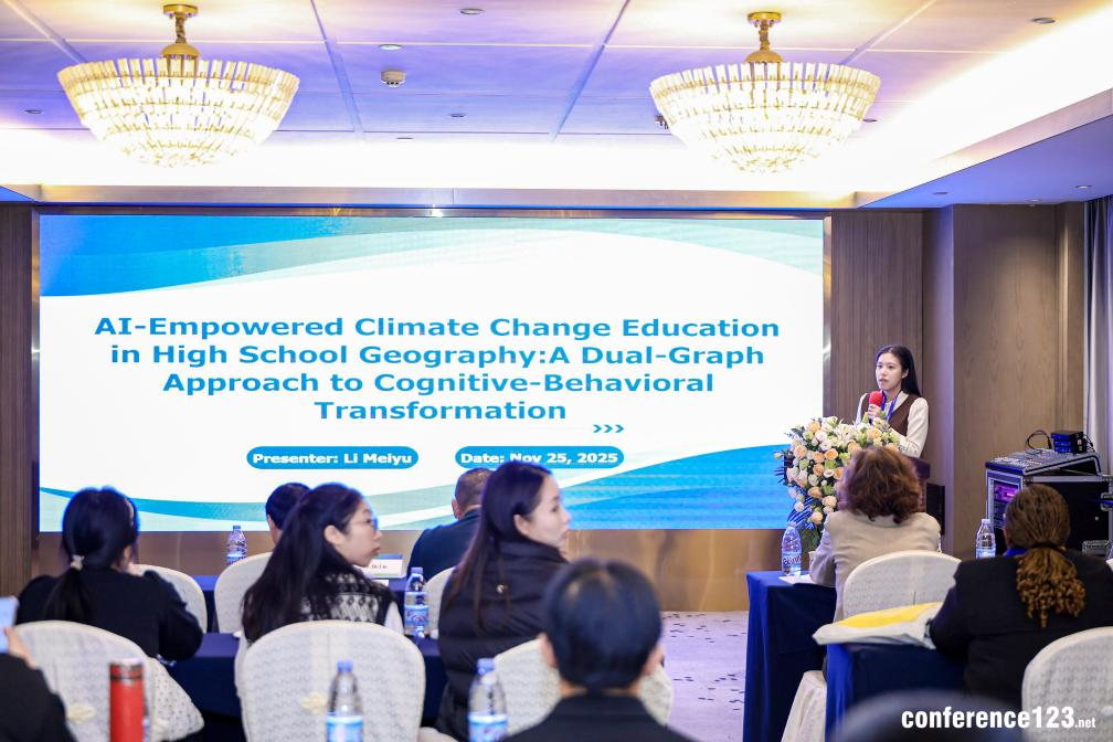 会议期间,李美豫同学作了题为“AI-Empowered Climate Change Education in High School Geography:A Dual-Graph Approach to Cognitive-Behavioral Transformation”的专题汇报。该汇报源于其主持的自治区研究项目《基于高中地理气候变化教育认知-行为转化机制视角下的AI技术干预策略设计》,是项目推进的一项重要阶段性成果。汇报围绕高中地理气候变化教育的现实挑战,深入阐释了人工智能双图模型在助力学生认知升级与行为转化中的应用机制,详细介绍了模型构建的核心逻辑、教学实践中的实施步骤,以及案例设计等关键内容,为智能技术与地理学科深度融合提供了具有参考价值的实践路径,引发了与会专家的热烈讨论与广泛关注。