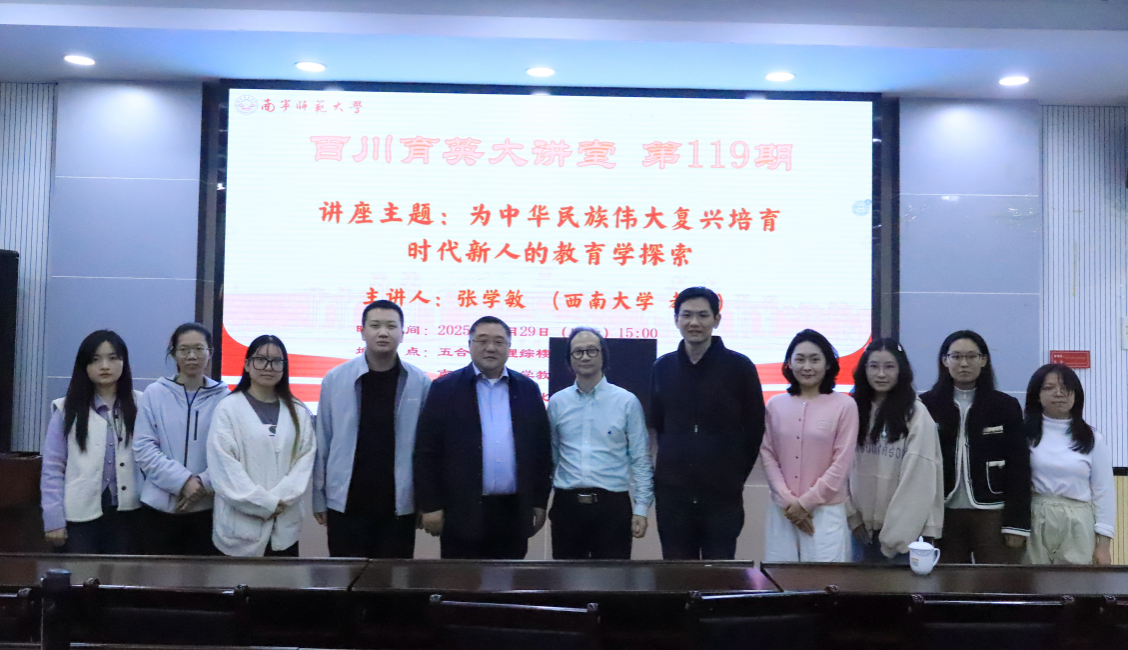 为切实加强师生对中国教育学自主知识体系建构的理解与研究,11月29日,由best365足球官网教育科学学院主办、广西教育现代化与质量监测研究中心承办的《百川育英大讲堂》第119期讲座在五合校区理综楼北1003室顺利举行。本期讲座邀请西南大学西南民族教育与心理研究中心主任、西南大学教育学部张学敏教授主讲“为中华民族伟大复兴培育时代新人的教育学探索”,由best365足球官网教育科学学院院长李强教授主持。