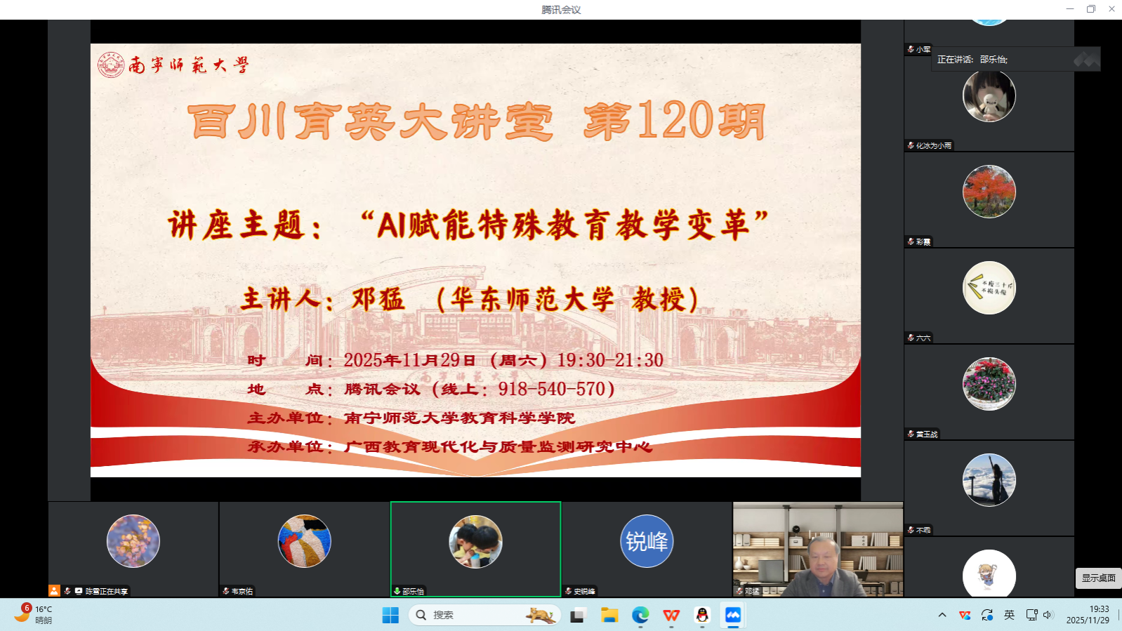 11月29日,为加深师范生对AI与特殊教育融合的认知,推动经验互鉴与资源共享,由best365足球官网教育科学学院主办、广西教育现代化与质量监测研究中心承办的《百川育英大讲堂》第120期讲座,通过腾讯会议顺利开展。本次讲座聚焦“AI赋能特殊教育教学变革”,特邀华东师范大学融合教育研究院院长邓猛教授主讲,由教育科学学院特殊教育系主任邵乐怡副教授主持,